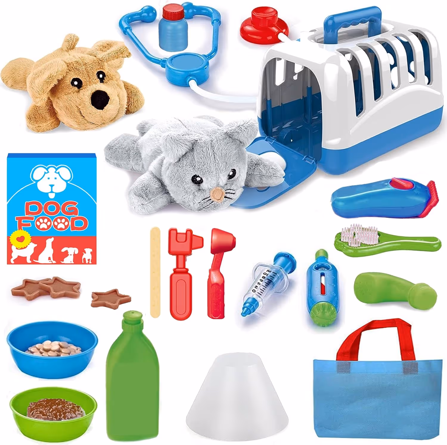This pretend play kit includes plush pets, food bowls, brushes, and accessories so kids can “feed, groom, and care” for their furry friends.